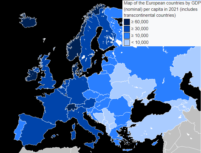 Mapa del PIB per cápita de los países de la UE, la desigualdad alcanza en algunos casos el 600% .