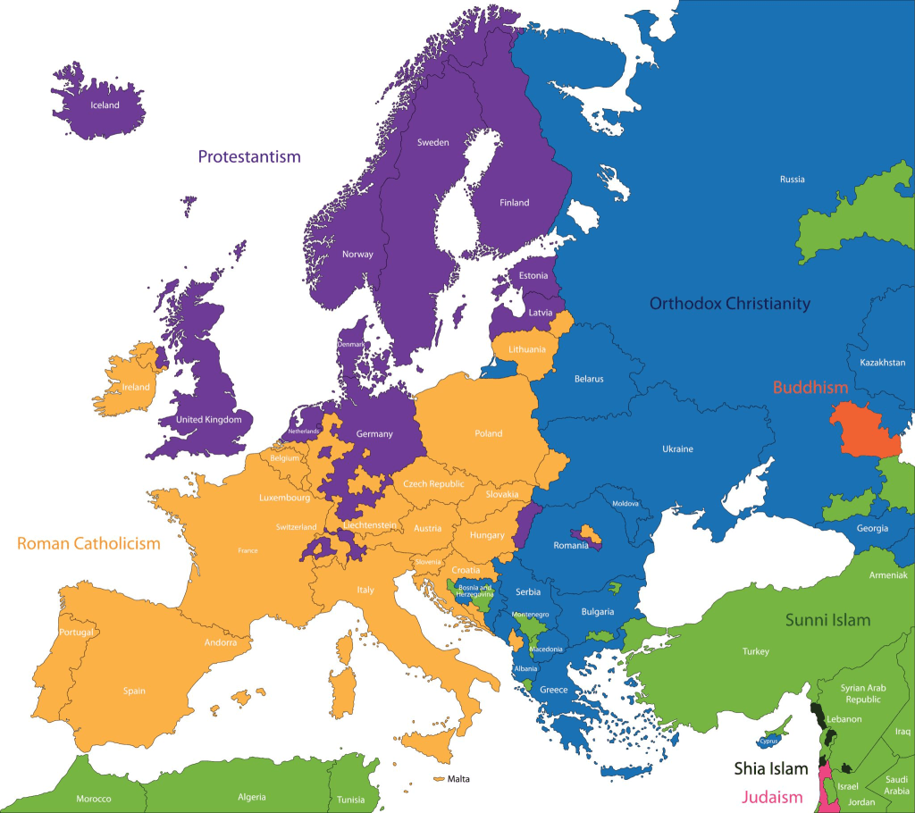 La religión también es otro aspecto, no menor, de esa diversidad europea que también tiene una evidente influencia en esa desigualdad. Las iglesias luteranas y calvinistas del norte, configuraron sociedades marcadas por una ética en la que la austeridad, la disciplina y la responsabilidad individual, favorecieron altos niveles de secularización, confianza en el estado y economías enfocadas en la productividad, el trabajo y el consenso social. En el sur y el este de Europa en cambio, las Iglesias Católica y Ortodoxa, en tanto que instituciónes sociales, educativas y morales, dieron como resultado sociedades con valores menos individualistas y más comunitarios, con jerarquías marcadas. Estas diferencias culturales y religiosas entre ambas europas se hacen más evidentes en tiempos de crisis, como quedó demostrado a la hora de diseñar planes europeos de reactivación económica en episodios como la crisis del euro (2008) o el Covid (2020) en los cuales se evidenciaron las diferentes formas de entender la sociedad de ambas culturas: La austeridad y el sálvese quien pueda de unos frente a la solidaridad y la búsqueda de soluciones comunes de los otros.