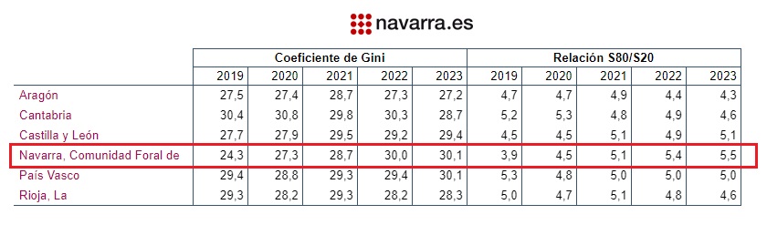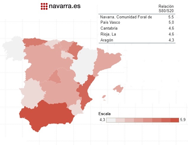 Relación s80/s20. Es un índice de desigualdad entre la población. La relación entre la renta media del 20% más rico con la renta media del 20% del  más pobre. En el mapa se aprecia como en Navarra la desigualdad es mayor que en cualquiera de sus comunidades vecinas.