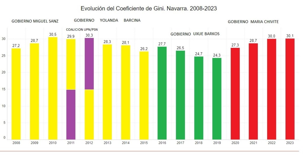 EVOLUCIÓN DE LA DESIGUALDAD EN NAVARRA. Se aprecia claramente que durante la legislatura de Uxue Barkos (en verde) la desigualdad descendió a cifras históricas. A partir de 2019, la desigualdad ha ido aumentando y actualmente a vuelto a máximos históricos.