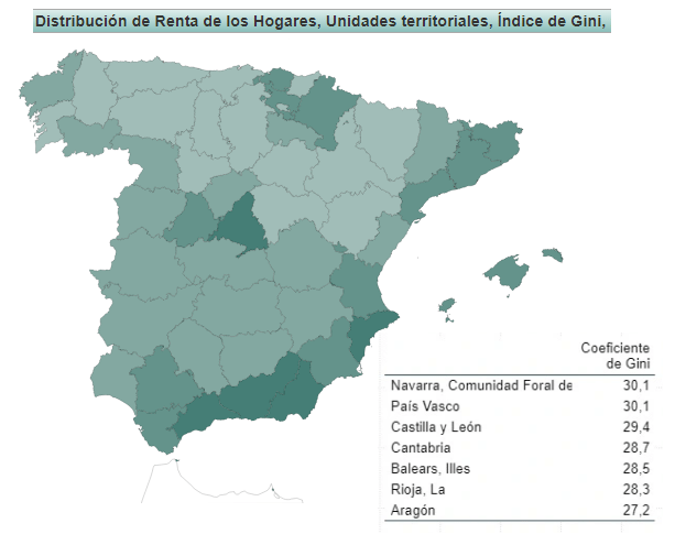 COEFICIENTE DE GINI. Es un numero entre 0 y 100, en donde cero se corresponde con la perfecta igualdad y todos tienen los mismos ingresos y 100 se corresponde con la perfecta desigualdad  en el que una persona tiene todos los ingresos y los demás ninguno. En el mapa se aprecia que Navarra es la comunidad con el peor índice de las de su entorno. (En el caso del País Vasco no está reflejado el índice particular de Gipuzkoa que es de 29.4).