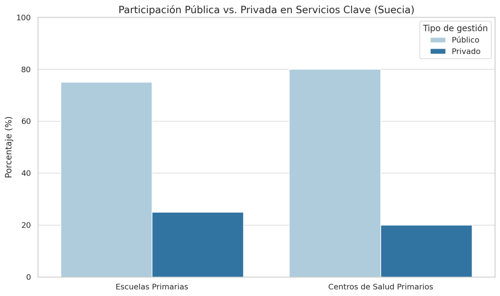 Este gráfico muestra cómo, aunque el financiamiento sigue siendo público, un porcentaje significativo de los servicios clave en Suecia —como la educación primaria y la salud— está gestionado por el sector privado.