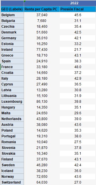 Primero os voy a presentar la presión fiscal. La presión fiscal es el porcentaje de los ingresos del PIB de un país que se recauda en forma de impuestos. Es fácil encontrar los datos en Eurostat, aqui los teneis para todos los países europeos: