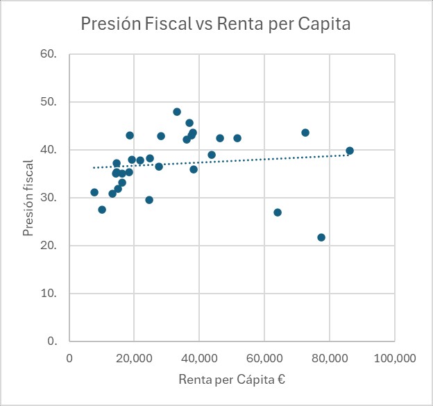 Veis alguna correlación? Yo ninguna. Es más, casi se podría ver una ligera tendencia ascendente por la que cuanto más rico es un país más presión fiscal tiene.